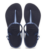 Havaianas Women's Freedom Slim Sandals - Navy features a stylish T-strap with an adjustable slingback for a warm-weather look that's comfortable and secure—now with a slim sole. Wear it for your next summer adventure with a chic white sundress or simply with your favorite swimsuit.