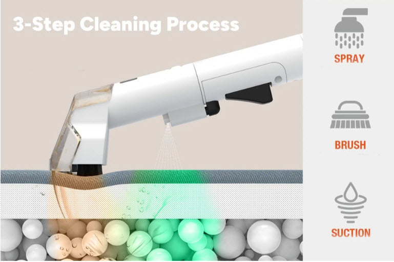 Tackle stubborn stains with the cleaner’s efficient 3-step cleaning process. Start by spraying the cleaning solution to effectively break down the dirt and stains. Next, gently scrub the surface using the brush head to loosen the dirt and stains from the surface. Finally, the powerful 15kPa suction power effortlessly dislodges and lifts the impurities from your carpet or upholstery.
