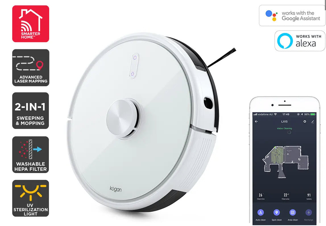 The Kogan SmarterHome™ LX15 Robot Vacuum Cleaner with UV and Mop boasts a built-in laser navigation system and smart infrared sensors that intelligently scan the surrounding environment and map the room to provide more efficient vacuuming, mopping and sterilisation.