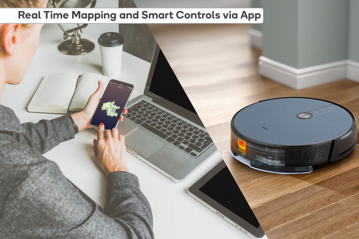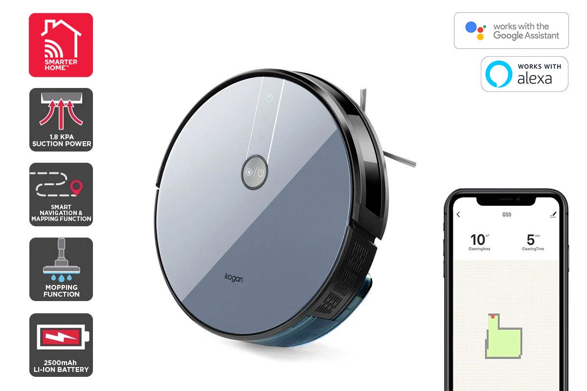 Smarter cleaning via apps Using the Kogan SmarterHome™ mobile app, you can set schedules, check your battery, switch modes, see where the vacuum has cleaned for better peace of mind and create a scene to vacuum before you get home from work, or control your device through Google or Alexa to get cleaning!