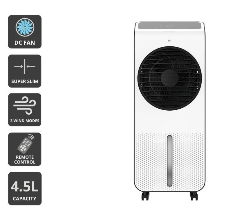 Experience cool and refreshing airflow with the Kogan Super Slim Evaporative Air Cooler. With motion and evaporation, it naturally cools your space while efficiently filtering dust particles into its 4.5L water tank for cleaner air.