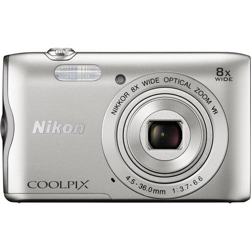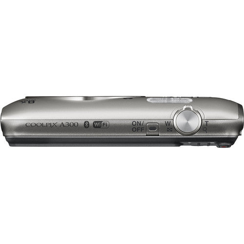 A slim, pocketable point-and-shoot for everyday shooting, the silver COOLPIX A300 from Nikon features versatile imaging capabilities along with a convenient form factor. Revolving around a 20.1MP 1/2.3" CCD image sensor, the A300 produces high-resolution stills along with HD 720p video, and offers an extended sensitivity range up to ISO 3200 for working in low-light conditions. A NIKKOR 8x optical zoom covers a 25-200mm equivalent focal length range, and is benefitted by Hybrid VR to minimize the appearance of camera shake. Additionally, the camera also incorporates a 2.7" 230k-dot LCD monitor, as well as SnapBridge wireless connectivity for transferring your imagery to a smartphone or tablet using Bluetooth or Wi-Fi + NFC.