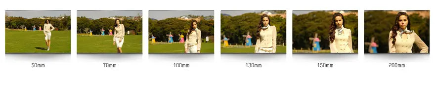 Angle of View is the area of a scene that can be seen through the lens. This changes as you zoom through the range of focal lengths: 50mm, 70mm, 100mm, 130mm, 150mm and 200mm.