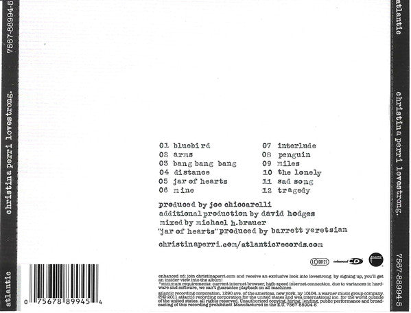 1 Bluebird 3:49 2 Arms 4:21 3 Bang Bang Bang 3:05 4 Distance 3:56 5 Jar Of Hearts 4:08 6 Mine 3:33 7 Interlude 0:50 8 Penguin 4:36 9 Miles 4:04 10 The Lonely 3:53 11 Sad Song 4:29 12 Tragedy 4:39