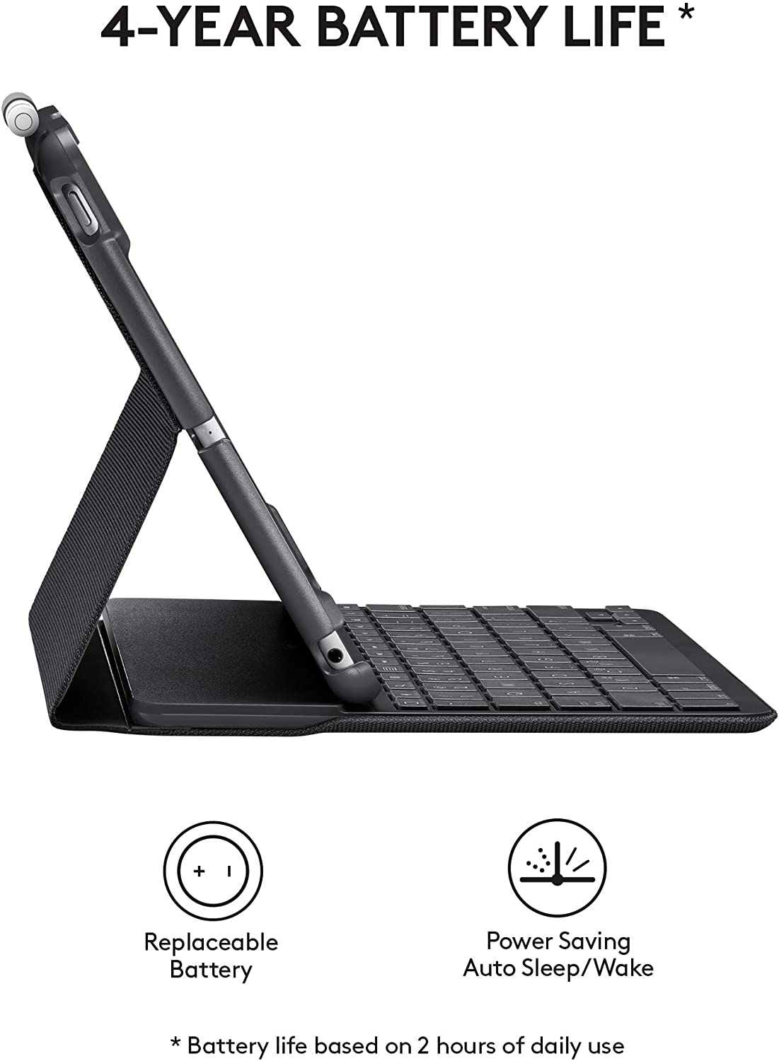 - Apple Pencil Holder: Slide your Apple Pencil into the holder– where it won’t get lost, or in the way.Water repellent, easy to clean fabric and durable plastic material ; Full size keyboard (17 millimeter key pitch) ; Scissor keys (1.5 millimeter key travel)