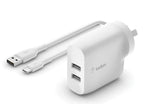 Belkin Dual USB-A Wall Charger 24W w/ USB-C Cable – White allows you to conveniently charge two phones, power banks, or tablets at the same time. It’s perfect when multiple devices need a charge and space is limited.