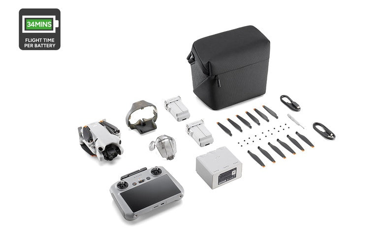 - 1 DJI Mini 3, 1 DJI RC, 3 Intelligent Flight Batteries, 3 pairs of Spare Propellers, 18 Spare Screws, 1 Screwdriver, 1 Gimbal Protector, 1 Type-C to Type-C PD Cable, 1 USB-C Cable, 1 Shoulder Bag, and 1 Two-Way Charging Hub