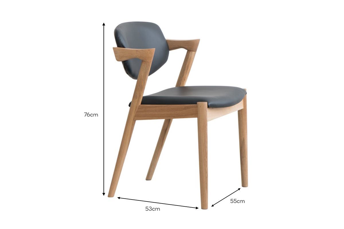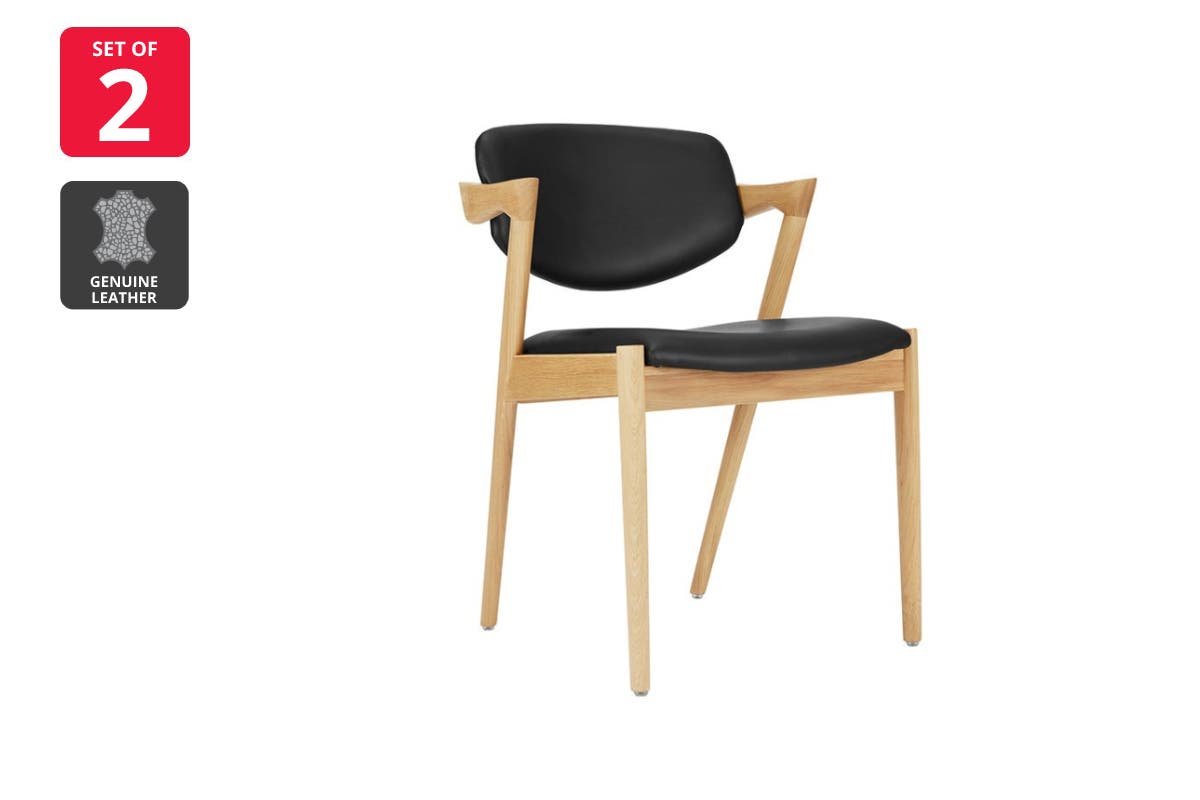 This chair has a unique design with bold, daring angles and a simplified form. It is made from natural materials in true Scandinavian fashion. The frame is made of wood and the upholstery is genuine leather. It is a set of 2 chairs.