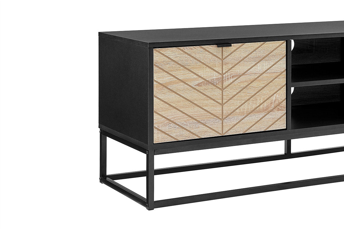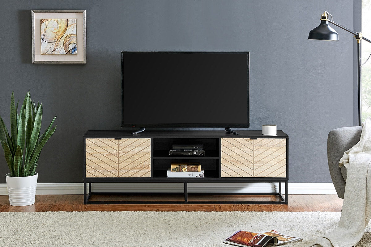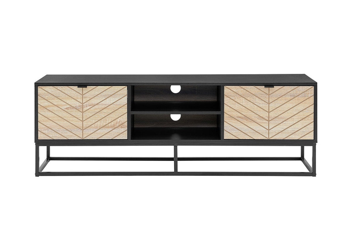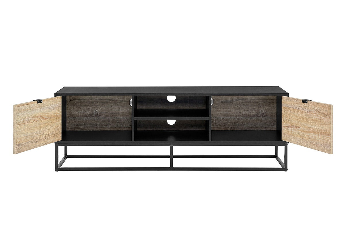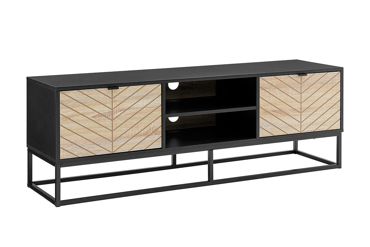 Powder-coated steel legs complete the look and make this unit extra sturdy, giving you a piece that will last.This piece of furniture is a contemporary entertainment unit that would look great in any living room. It has plenty of storage space with two open shelves and two cupboards. The unit also has a modern look with clean lines and exposed industrial metal tubing.