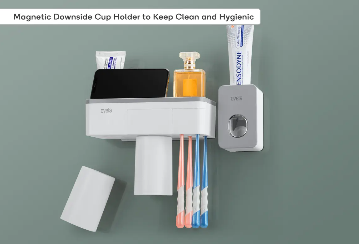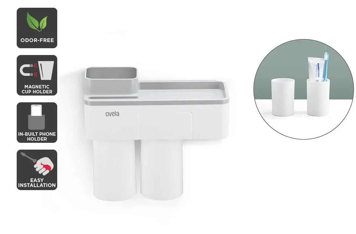 Innovative and convenient, this bathroom organiser features a hanging toothbrush rack, toothpaste dispenser, built-in phone holder, downside magnetic cup holders and a spacious storage platform to neatly hold your essentials and help you keep your bathroom clean and organised.