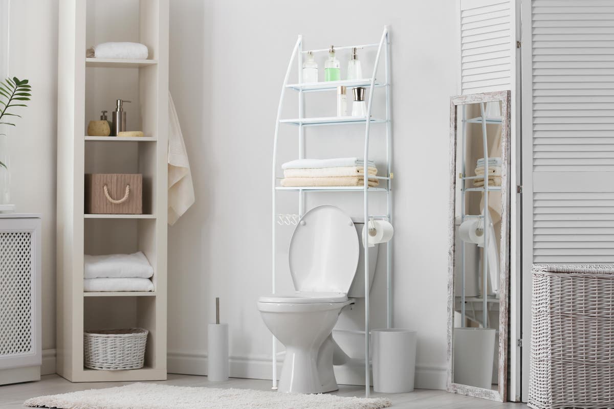 Create more space in your bathroom with this slim, space-saving storage rack that fits over your toilet.