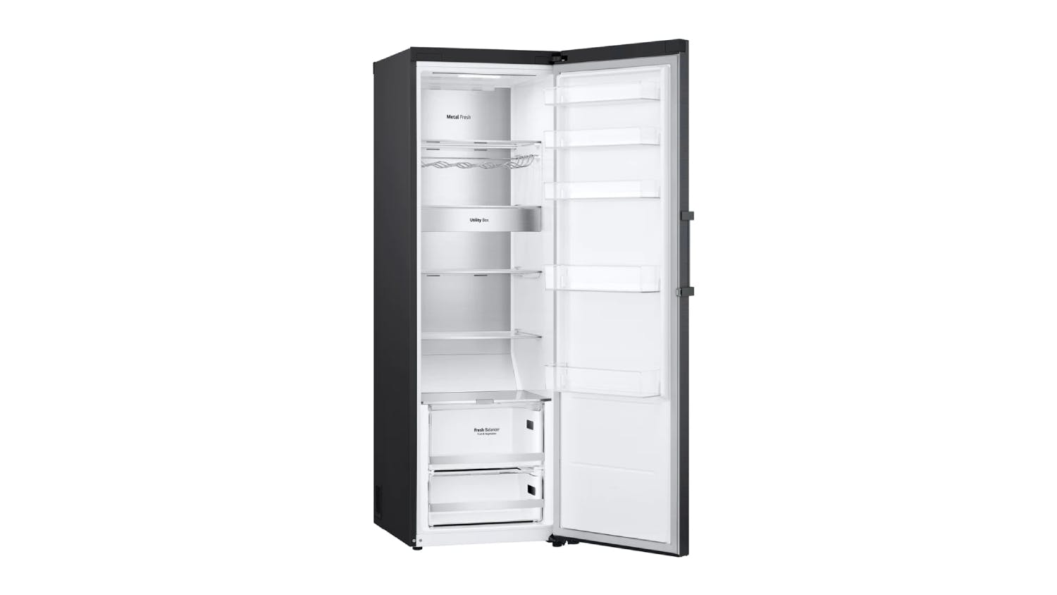 - Food Compartment: Efficiently stow away your groceries using this LG 386L Single Door Fridge. This unit comes with various food organisers, including five fixed shelves, one utility rack, one moisture balance crisper, one wine rack, five fixed door baskets, one drawer, and a wine bottle holder.