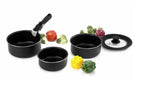 The cookware set features secure yet easily detachable handles, reducing clutter on your stovetop. Additionally, this allows for the pans to be stacked in a more compact area than traditional pots, keeping your kitchen shelves or drawers neat and tidy.