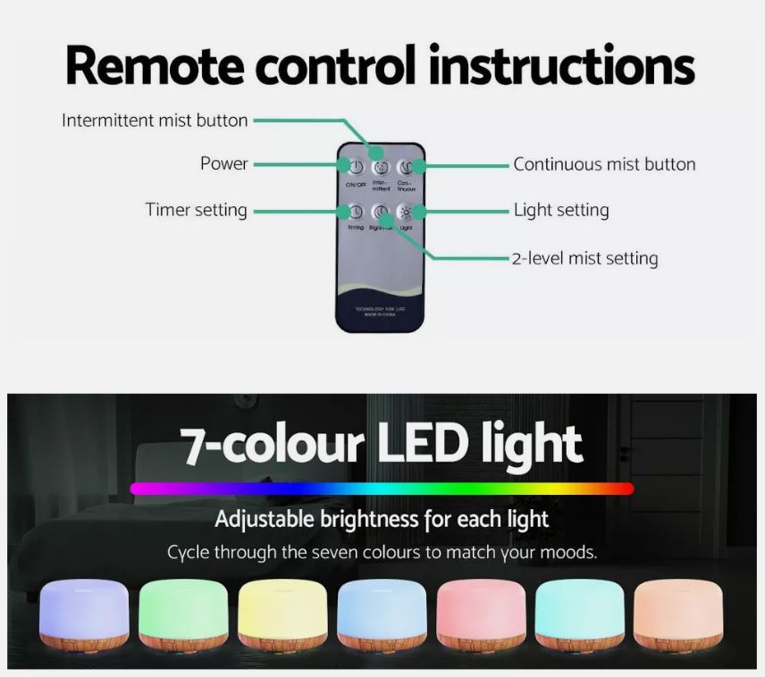 This Aroma Diffuser uses Ultrasonic waves to instantly vaporize water and essential oil in the tank, to produce a cool, dry fragrant mist.