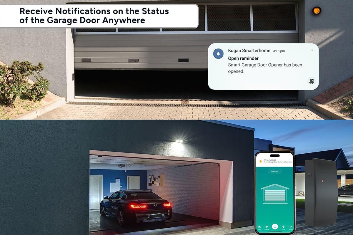 - Receive optional notifications, such as: if your garage door has been accidentally left open Access your garage from anywhere in the world Let in family members, guests, or couriers while you're away with the Kogan SmarterHome app on your phone, and enjoy peace of mind by ensuring your door is securely closed from anywhere in the world