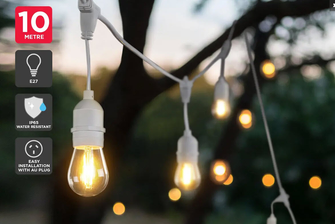 Transform your garden or entertaining area with the Outdoor Festoon String Light with LED Filament Bulb (White, 10m) that will bring warm light and a welcoming atmosphere to your home.