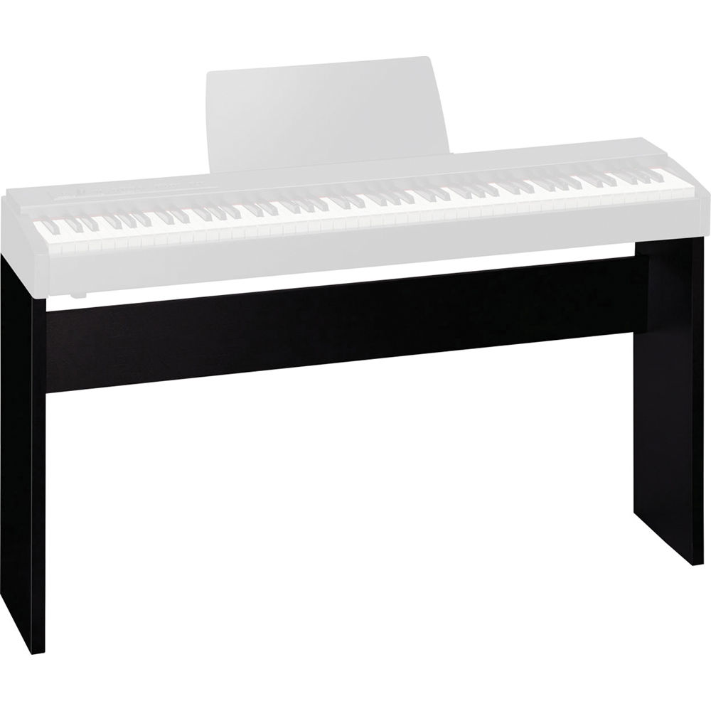 The contemporary black KSC-68-CB Piano Stand for F-20 Digital Piano from Roland is designed to hold a Roland F-20 digital piano. It features a hook for storing headphones.