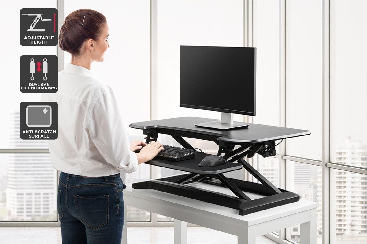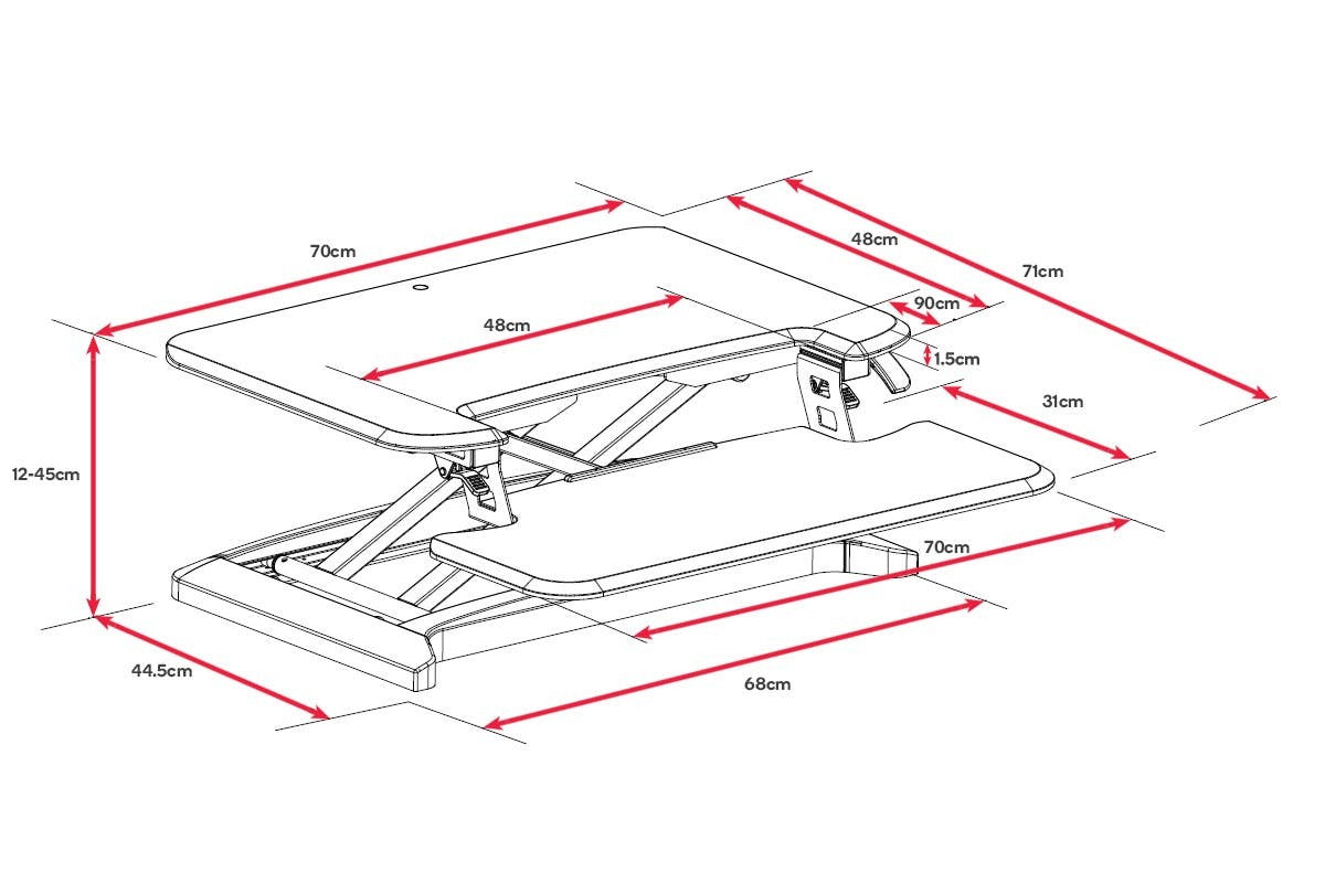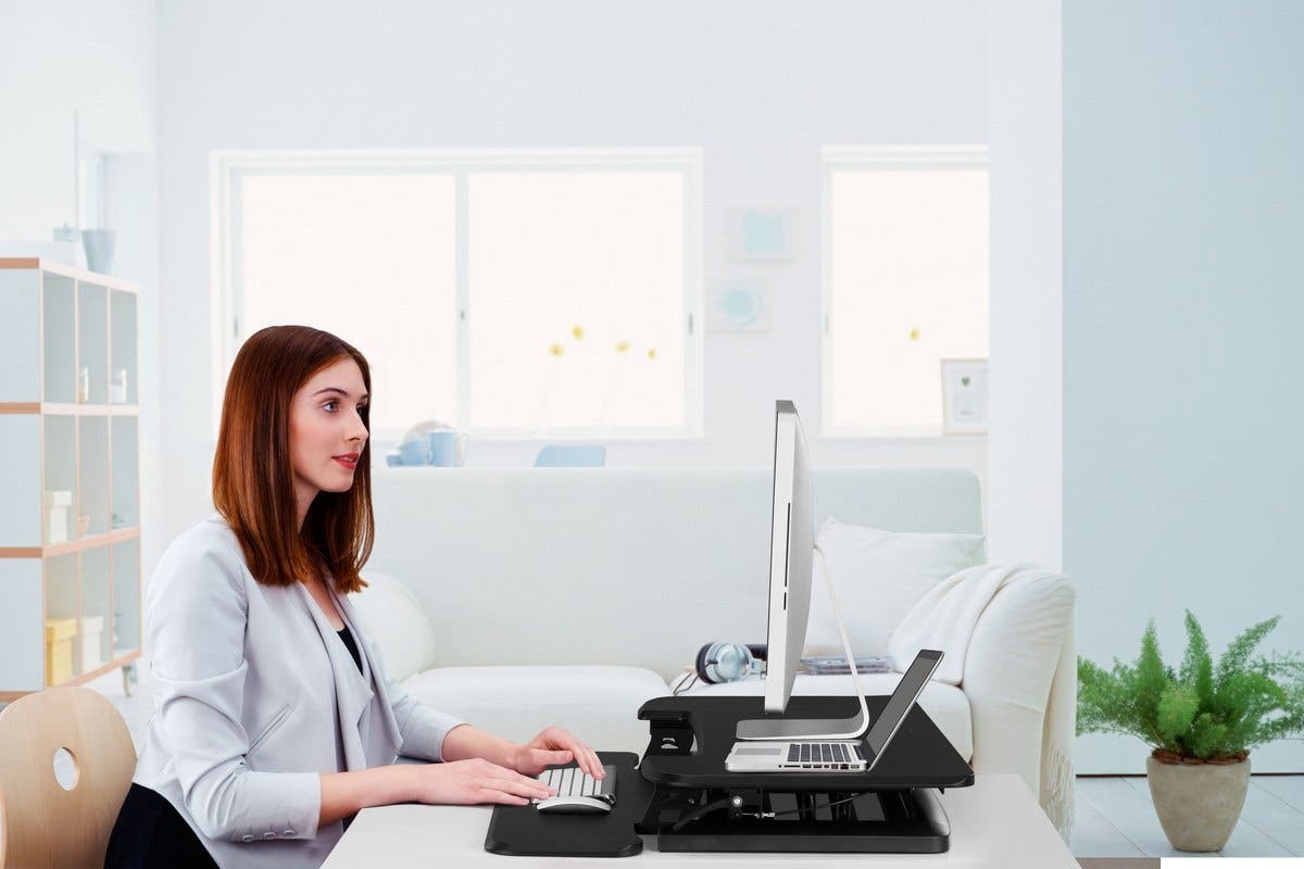 Ergonomically designed with your wellbeing in mind, this premium sit stand desk riser can be raised and lowered in seconds to help reduce muscle tension and increase workday productivity.