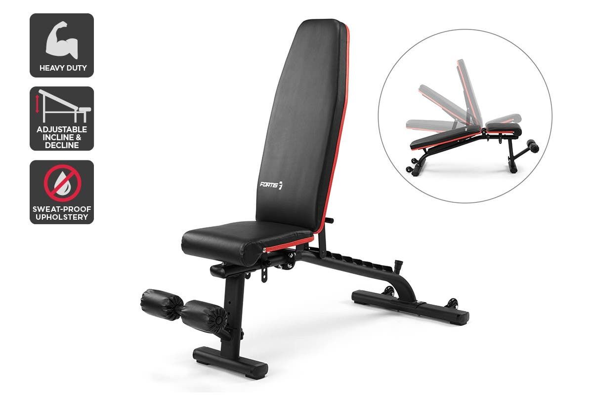 Get through your sets in comfort thanks to the padded upholstery, supportive footrests, and stable design of the Fortis Heavy Duty Adjustable FID Weight Bench.