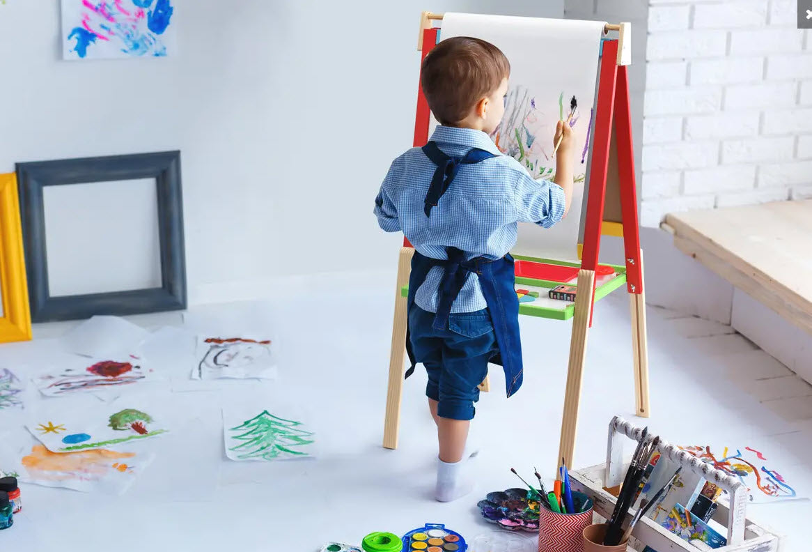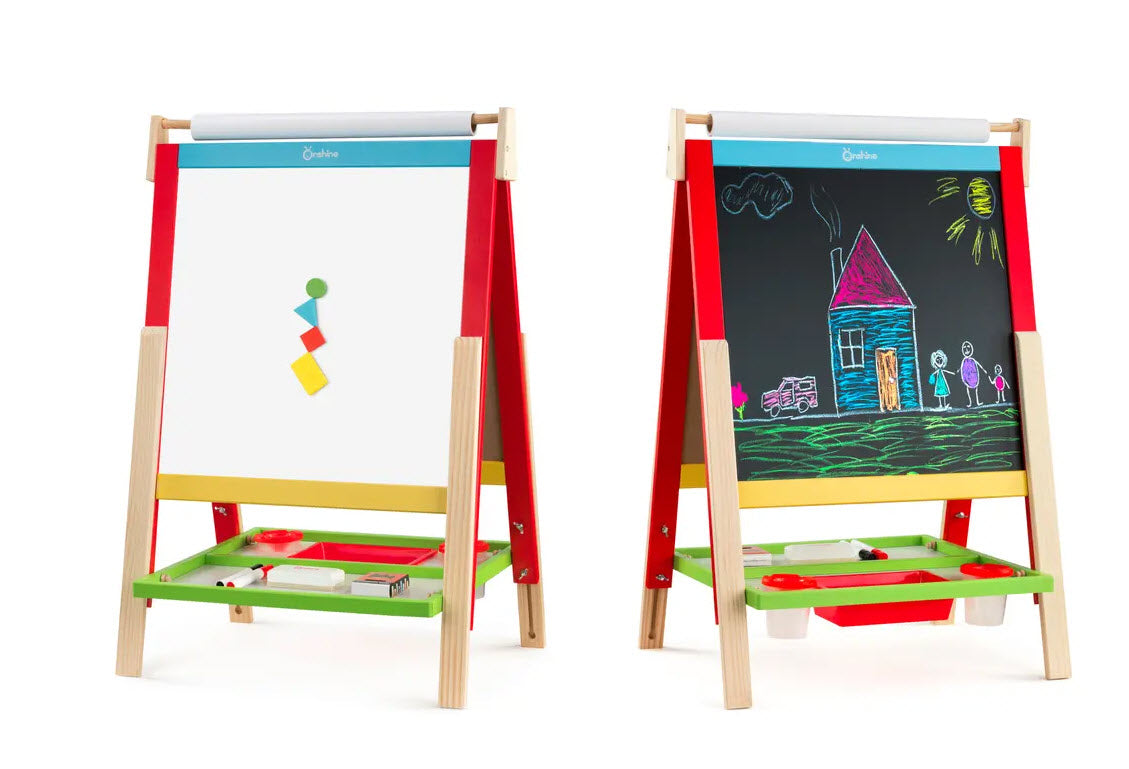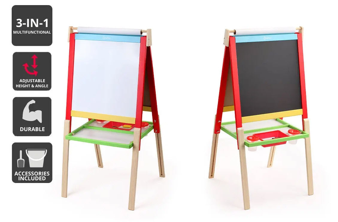 From inspiring budding young artists and kids who love to doodle, to providing indoor entertainment on wet weather days, this versatile wooden easel is the ultimate choice when it comes to giving your little one endless hours of fun-filled play. This 3-in-1 easel has a whiteboard, blackboard, and paper roll, so your child can draw, paint, sketch, learn, and play! It’s ideal for both standing and seated positions, and features a durable wooden construction. The quick-release tabs make it easy to adjust the height, and the foldable design is perfect for slim, easy storage.