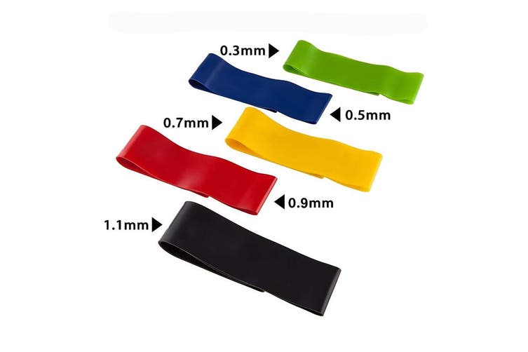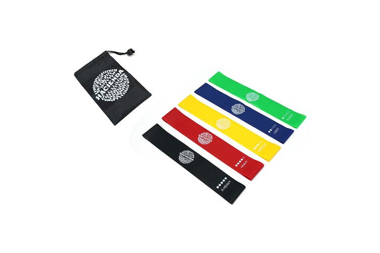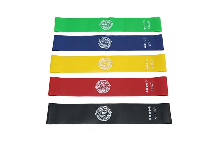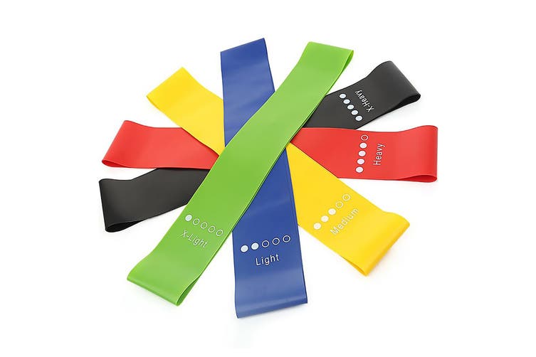 5-Piece Resistance Band Loop Set with five colour-coded variable-resistance stretch band loops ranging from extra light to extra heavy