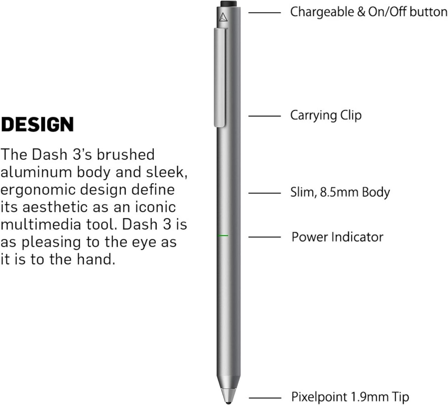 Feel secure carrying this ultimate stylus to the coffee shop or to the next meeting with its classic pen clip design. Dash is your click-and-go stylus with a thin, balanced, aluminium body, perfect for fast ideas in a digital world.