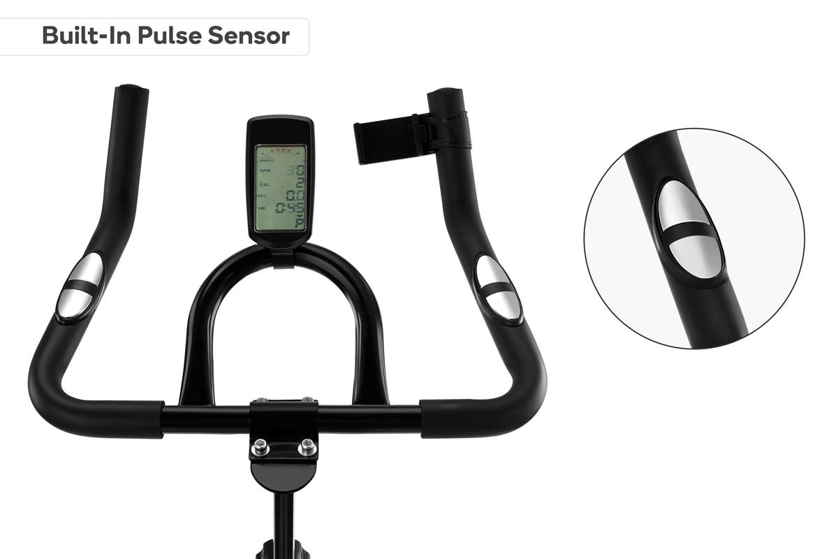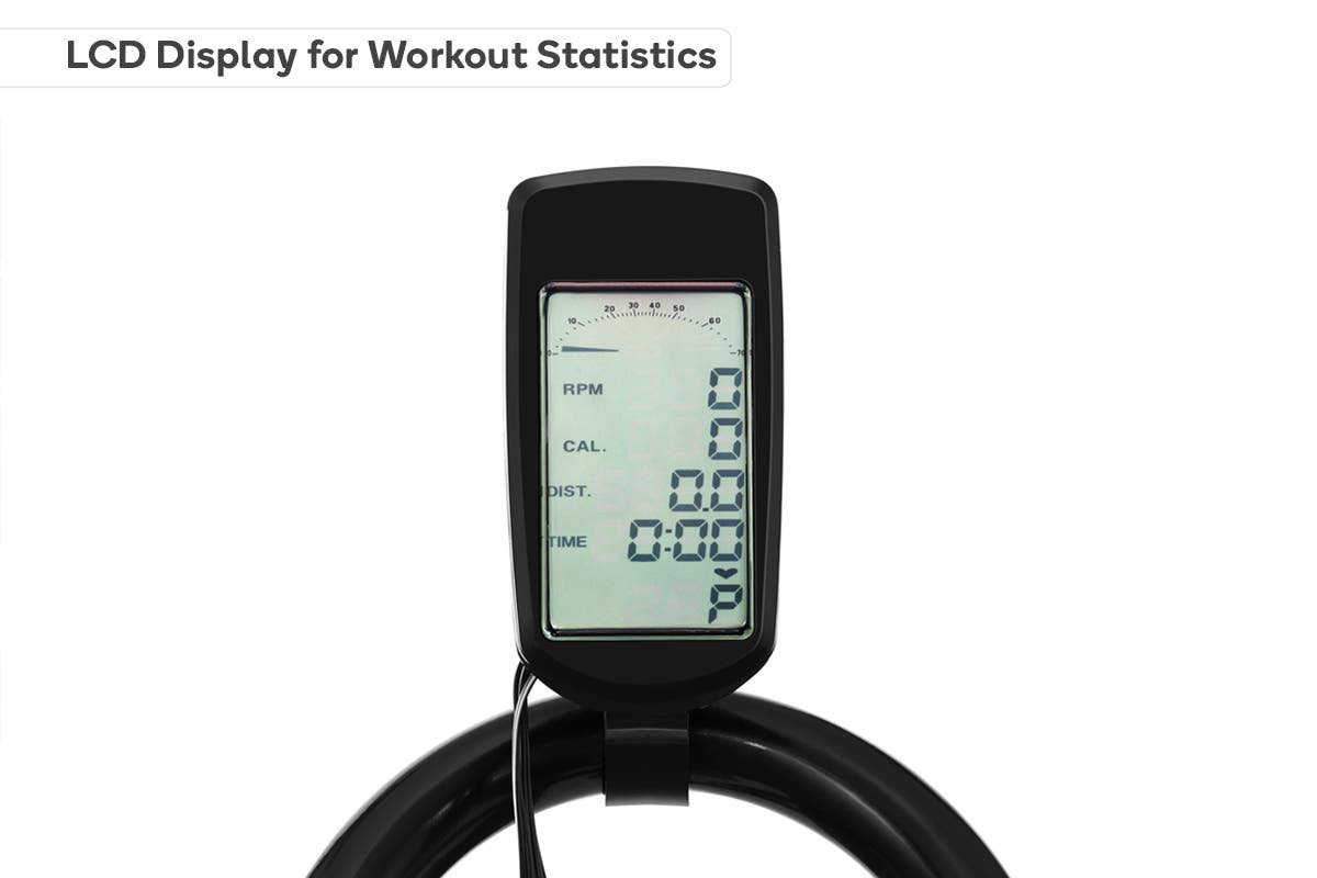 - Built-in LCD display monitors speed, distance, pulse and calories
