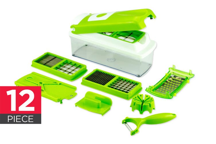 Make chopping and dicing quick and easy The Multi-Purpose 12 Piece Slicer is a precision food chopper with interchangeable blades that allow for quick and easy dicing without all the mess! Just place vegetables in the Slicer, press down and let the dicing begin! Slice and dice, any way, any size Cut vegetables, fruits and more into cubes, sticks and wedges of a variety of different sizes. Regardless of what you are making, the Multipurpose 12 Piece Slicer will have the setting you need. The slicer also makes your chopping consistent — perfect for cooking your food for exactly the right amount of time, and eliminating the usual small charred pieces and large undercooked pieces. It will also look perfect on the plate which means you’ll get full points for presentation at the next summer BBQ! No more crying over onions! Don’t cry — you can use the 12 Piece Slicer! Because it covers the food while it chops it, and gets the chopping done in a matter of seconds, the pain and tears of chopping onions will be a thing of the past! Packed with useful features