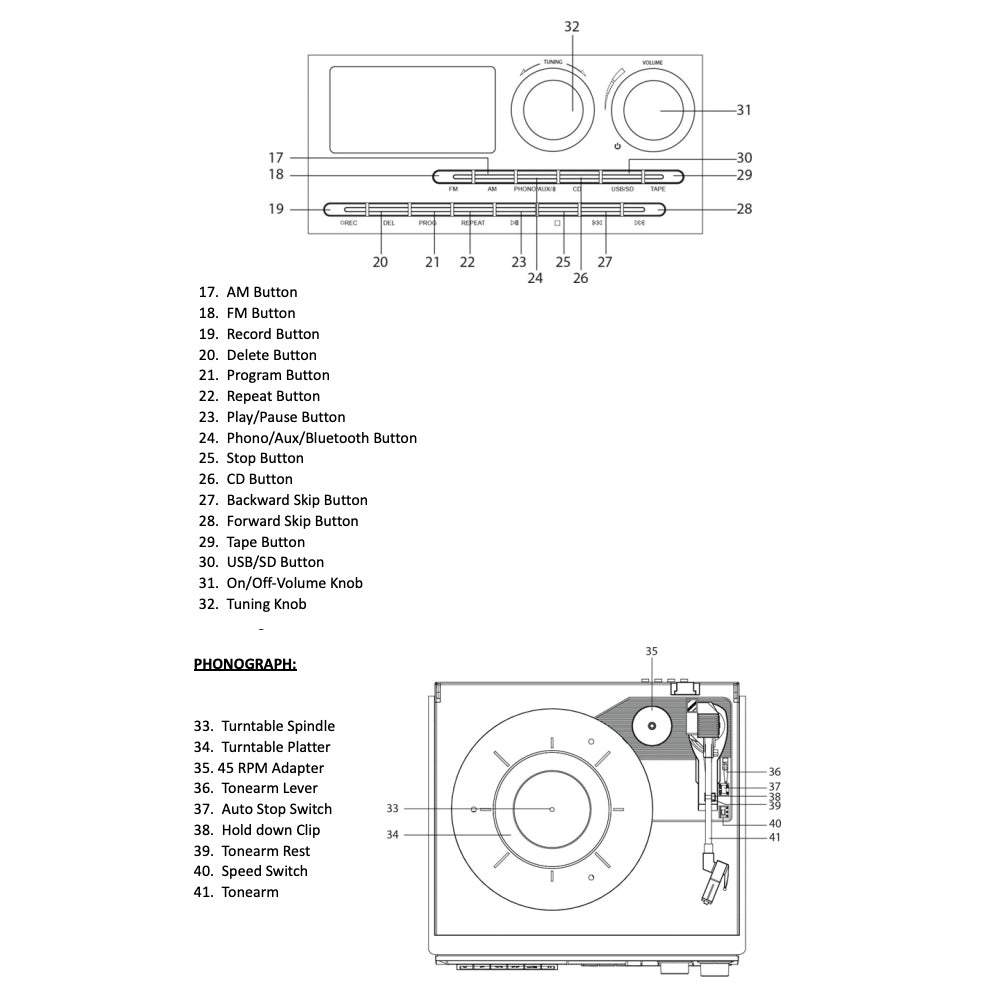 - Features: Bluetooth 5.0, 3-speed turntable (33, 45, 78), cassette tape player, CD, aux-in, USB, SD/MMC, AM/FM radio, wooden speaker boxes, large LCD, headphone-out, RCA-out, programmable CD, supports CD-A/CD-R/CD-RW, anti-erase overwrite protection for cassette tape, 45RPM adapter, remote control