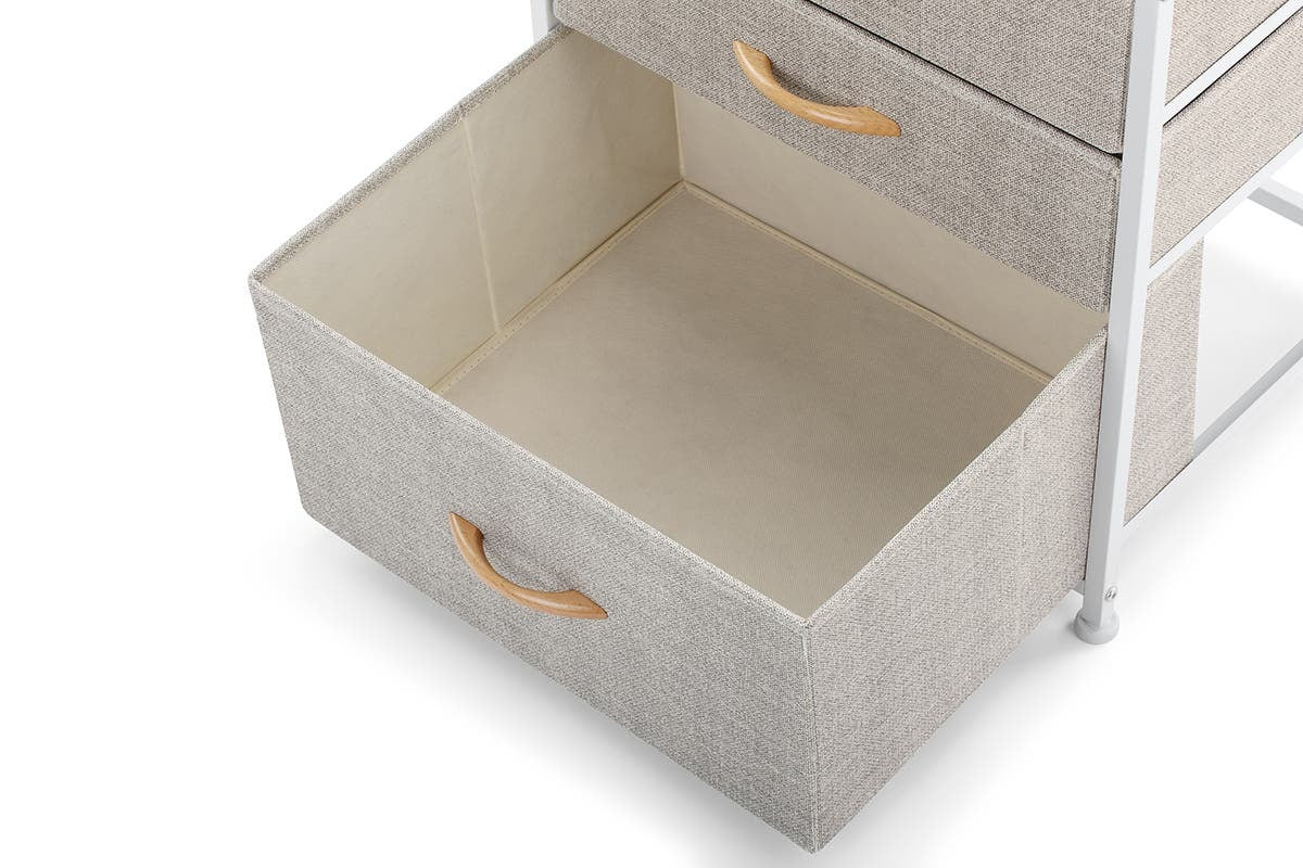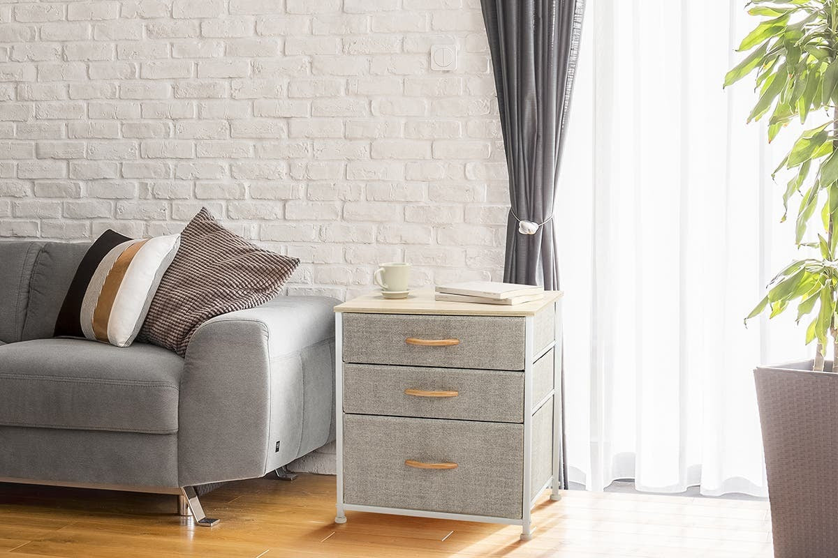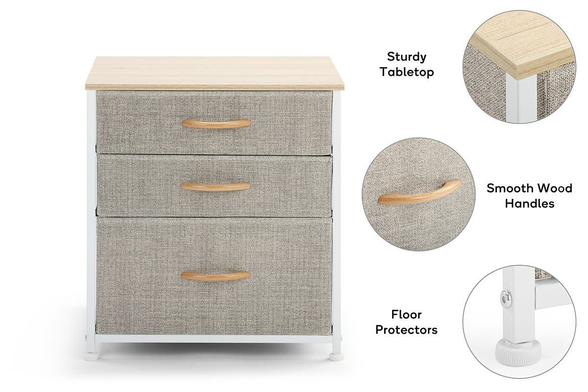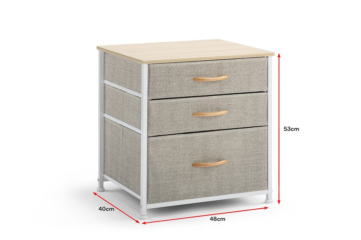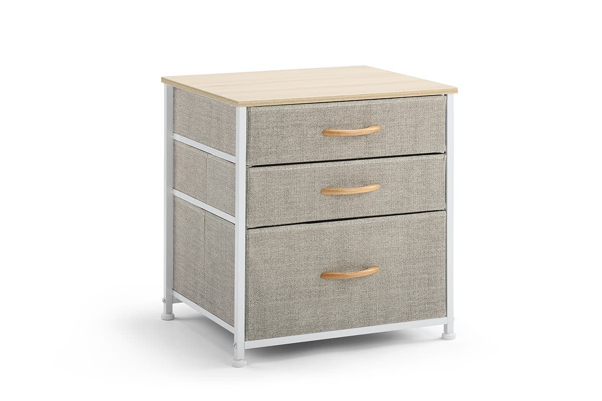 Boasting breathable fabric drawers and sturdy top shelf space, the Ovela 3 Drawer Nightstand Bedside Table offers effortless storage for all your nighttime essentials while the simple and clean beige design complements your existing bedroom decor.