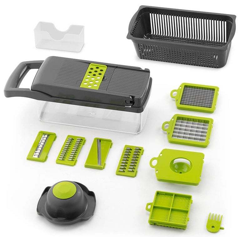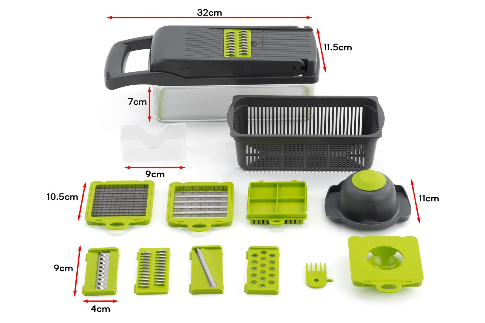 8 Interchangeable stainless steel blades: 1 x dicing blade, 1 x small dicing blade, 1 × 2mm * slicing blade, 1 × 3mm shredding blade, 1 × 4mm shredding blade, 1 x waffle blade, 1 x * * peeler and 1 x meshing